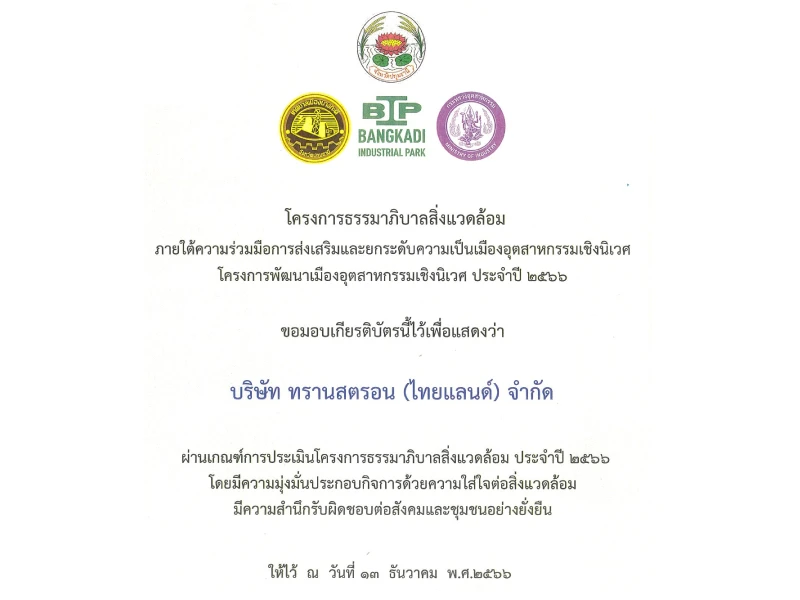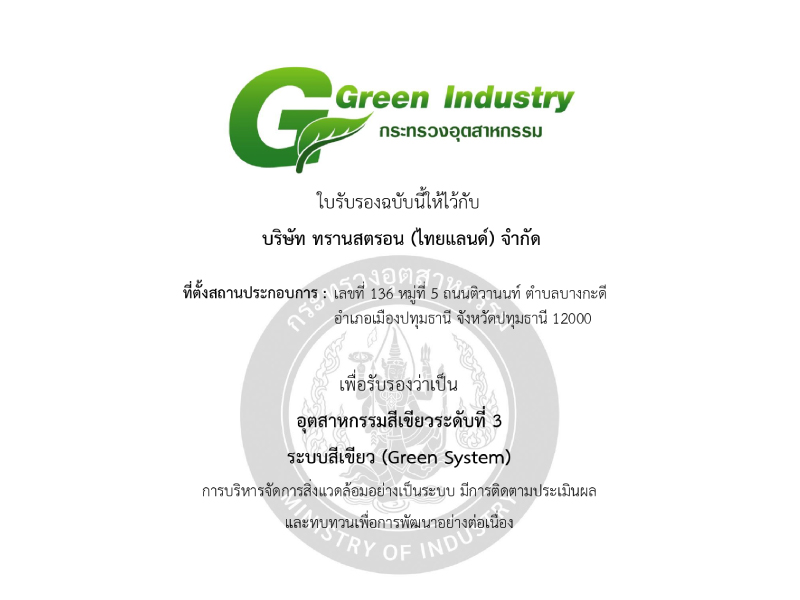 On 15 May 2024, Transtron(Thailand) Co.,Ltd. received “Green Industry award Level 3 :Green system” from Green Industry project of the Ministry of Industry that has certified for systematic environmental management, monitoring, evaluation and review for continuous development.