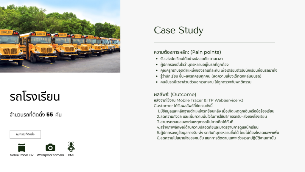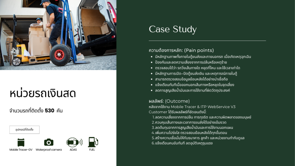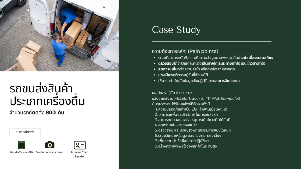 ผลิตภัณฑ์ Mobile Tracer-GV และ ITP WebService V3 เป็นระบบติดตามยานพาหนะอัจฉริยะ พร้อม Solutions ที่ตอบโจทย์การใช้งานหลากหลายธุรกิจ ขับเคลื่อนการขนส่งให้มีประสิทธิภาพ ควบคุมง่าย เห็นผลชัดเจน